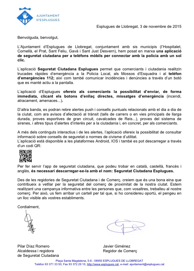 Nova APP per dispositius mòbils per contactar amb la policia amb un sol clic. #Esplugues @Ajesplugues @Ubesplugues