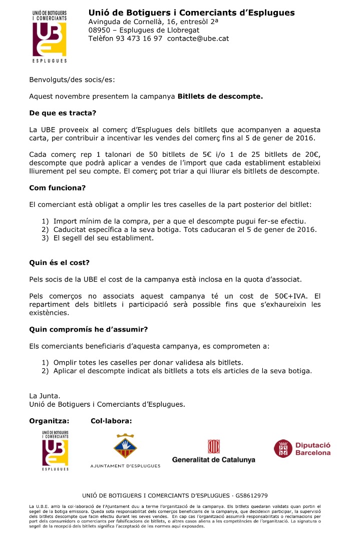 Home / Presentació de la campanya BITLLETS DESCOMPTE: Els clients del #comerç d’#Esplugues obtindran Bitllets Descompte per bonificar les compres d’aquest #Nadal. @UBEsplugues #Esplugues @Ajesplugues