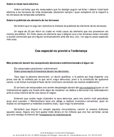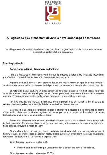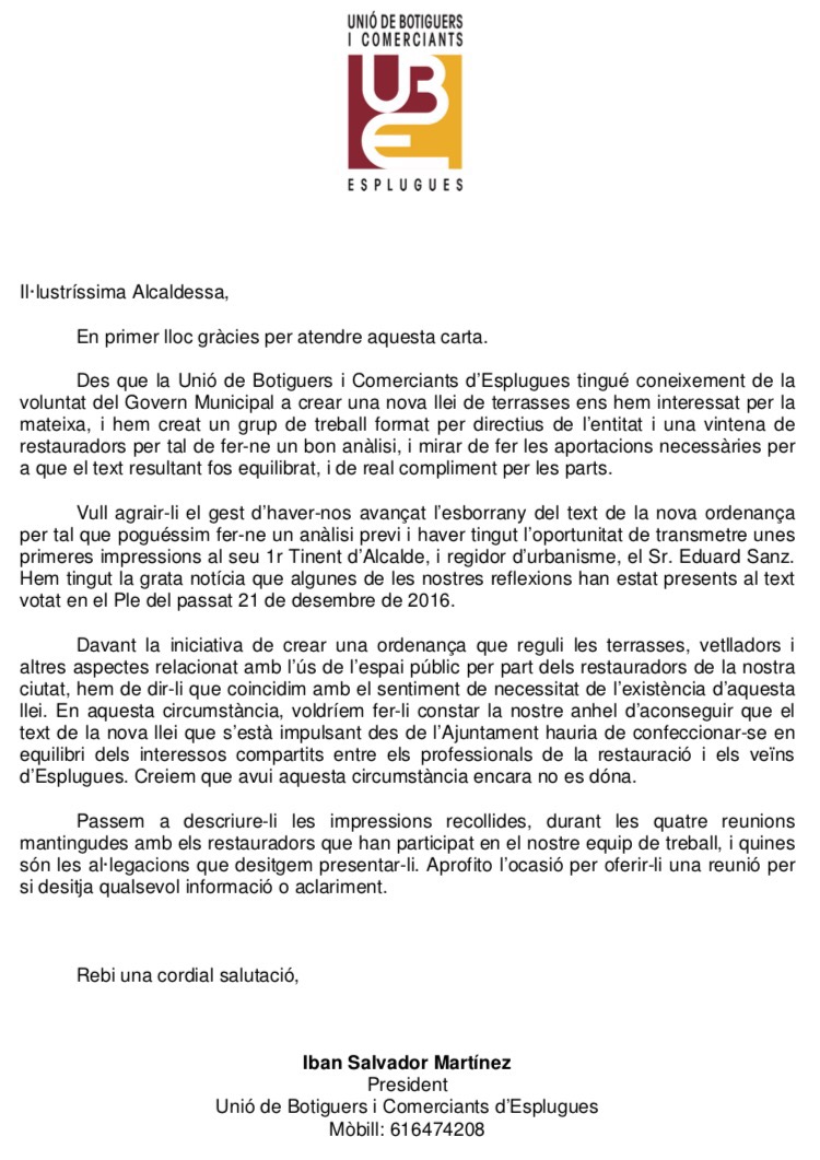 La Unió de Botiguers presentem el document d’al.legacions a la nova ordenança de terrasses i vetlladors. @UBEsplugues #Esplugues