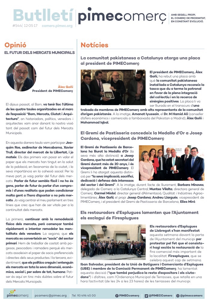Iban Salvador, president de la Unió de Botiguers i Comerciants d’Esplugues (UBE) i membre de la Comissió Permanent de PIMEComerç, ha lamentat aquesta decisió (“que també perjudica la resta d’expositors i els ciuta- dans”) i d’altres, com l’Ordenança Municipal de Terrasses, que retalla en una hora l’activitat (de les 24 a les 23 hores) de les terrasses del municipi.