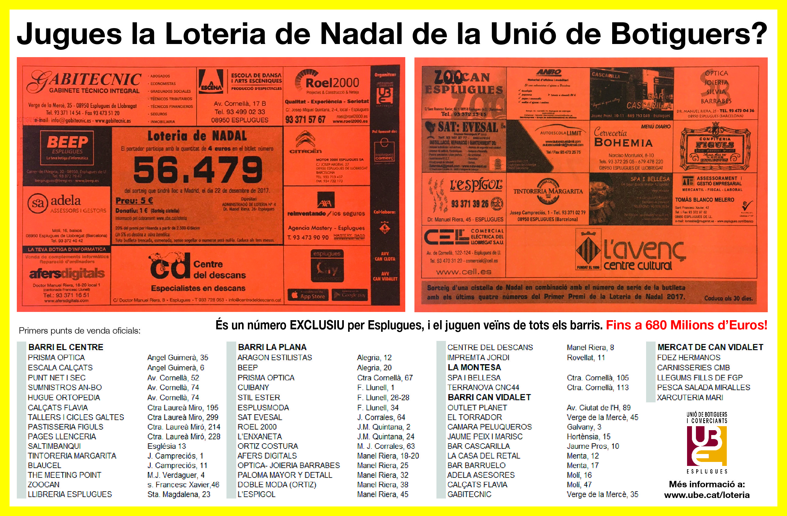 Jugues la Loteria de Nadal de la Unió de Botiguers? És un número EXCLUSIU per #Esplugues. Fins 680 Milions d’Euros! @UBEsplugues
