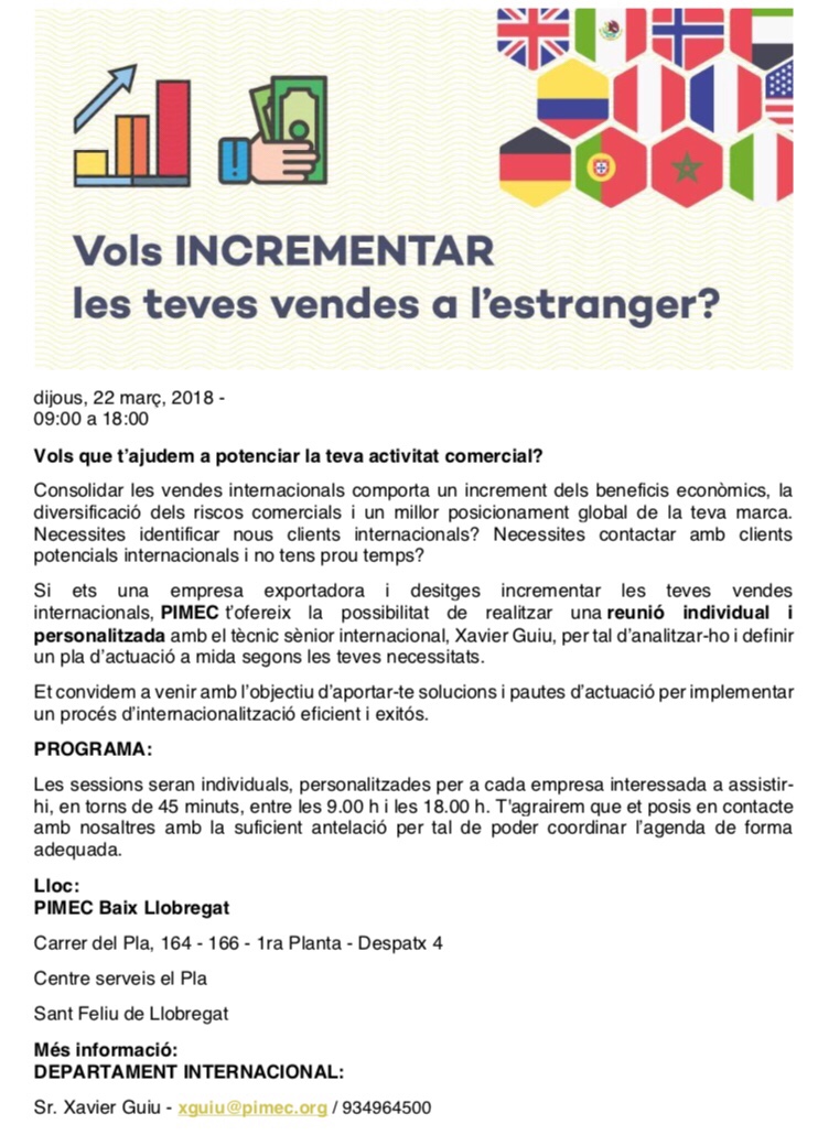 Es tracta de sessions individuals personalitzades per a cada empresa interessada en assistir (d’uns 45 minuts aprox.), aquesta trobada pretén a ajudar als nostres socis a potenciar les seves activitats comercials i consolidar les vendes internacionals.