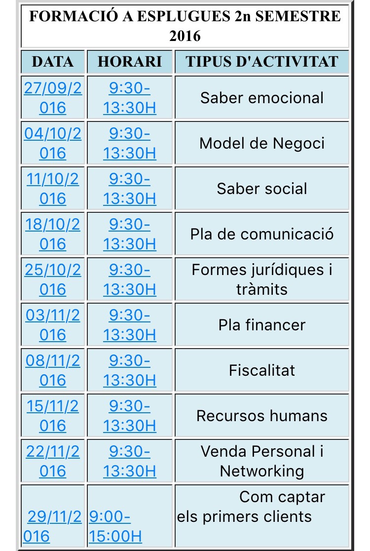 Aquest és el quadre resumit de les formacions. També us adjuntem un PDF amb més detalls sobre aquest mòduls. Tots els mòduls es realitzaran a l’Esplugues Coworking de l’Ajuntament d’Esplugues (Av. Verge de la Mercè, 1 ESPLUGUES).